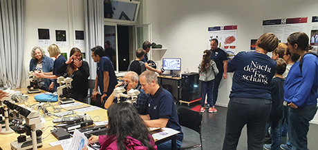 The Nacht der Forschung at the University of Bern took place on September 10, 2022. The room of the microscopy imaging center (MIC), UniS A015, was decorated with various posters about the MIC and about microscopy at our University. Activities included "Microscopy for everyone" on 6 teaching microscopes and an excursion into virtual reality, which beamed the guest into the brain of a mouse or into a fish head. In room A-126 of UniS, microscopists offered lectures on exciting topics. A total of around 30 helpers from the MIC committee, friends of the MIC and students of the PhD program Cutting Edge Microscopy headed by Fabian Blank, Ruslan Hlushchuk and Ruth Lyck were on duty in 3 shifts from 4:00 p.m. to midnight. Further activities of MIC committee members were offered in the University’s main building by Stefan Tschanz and Benoît Zuber on behalf of the Institute of Anatomy. All activities were eagerly attended. Interested conversations and happy children's faces testified to the success of our offers. The MIC team says a big "THANK YOU" to all the helpers, without whom the MIC activities would not have been possible.